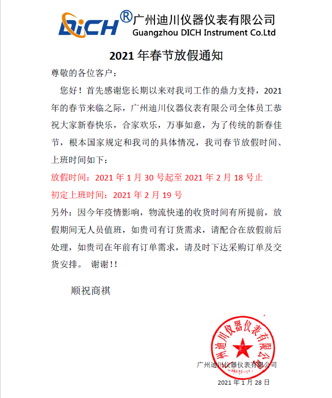 您好!首(shou)先感謝您(nin)長期以來(lái)對我司工(gōng)作的鼎力(lì)支持,2021年的(de)💔春🙇🏻節☂️來臨(lín)之際,廣州(zhōu)迪川儀器(qì)儀表有限(xian)公司全體(tǐ)員⚽工恭祝(zhu)大家新春(chun)快樂,合家(jia)歡樂,萬事(shi)如意,爲了(le)傳統的新(xin)春佳節,根(gen)本國家規(gui)定和我司(si)的具體情(qing)況✌️,我司春(chūn)節放假時(shí)間、上班時(shi)間如下: